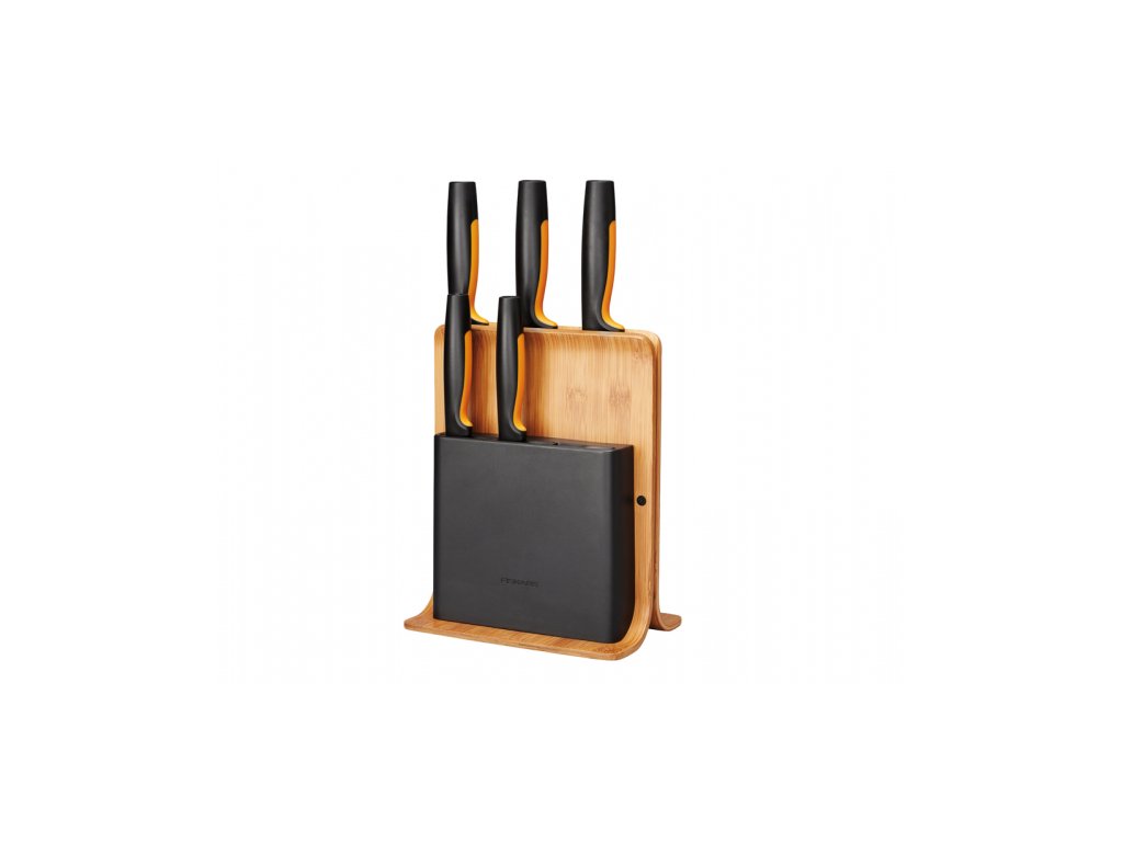 Designový blok vyrobený z bambusu a plastu. Ideální pro bezpečné skladování nožů. Blok obsahuje 5 nejdůležitějších nožů z řady Functional Form: okrajovací nůž, snídaňový nůž, nůž Santoku, velký kuchařský nůž a nůž na pečivo. Výška: 37,1 cm, délka: 20,2 cm, šířka: 14,2 cm. Hmotnost: 1,07 kg.